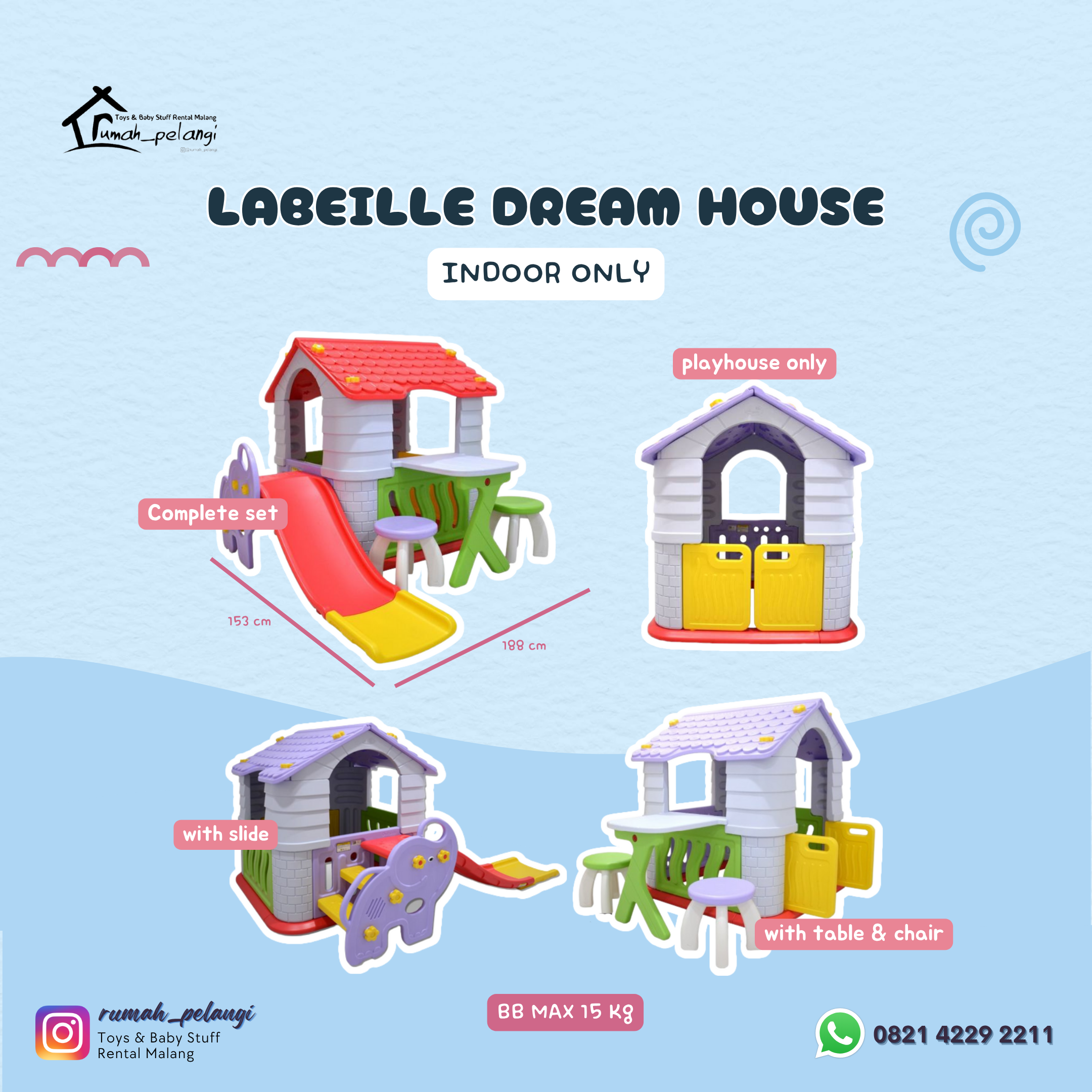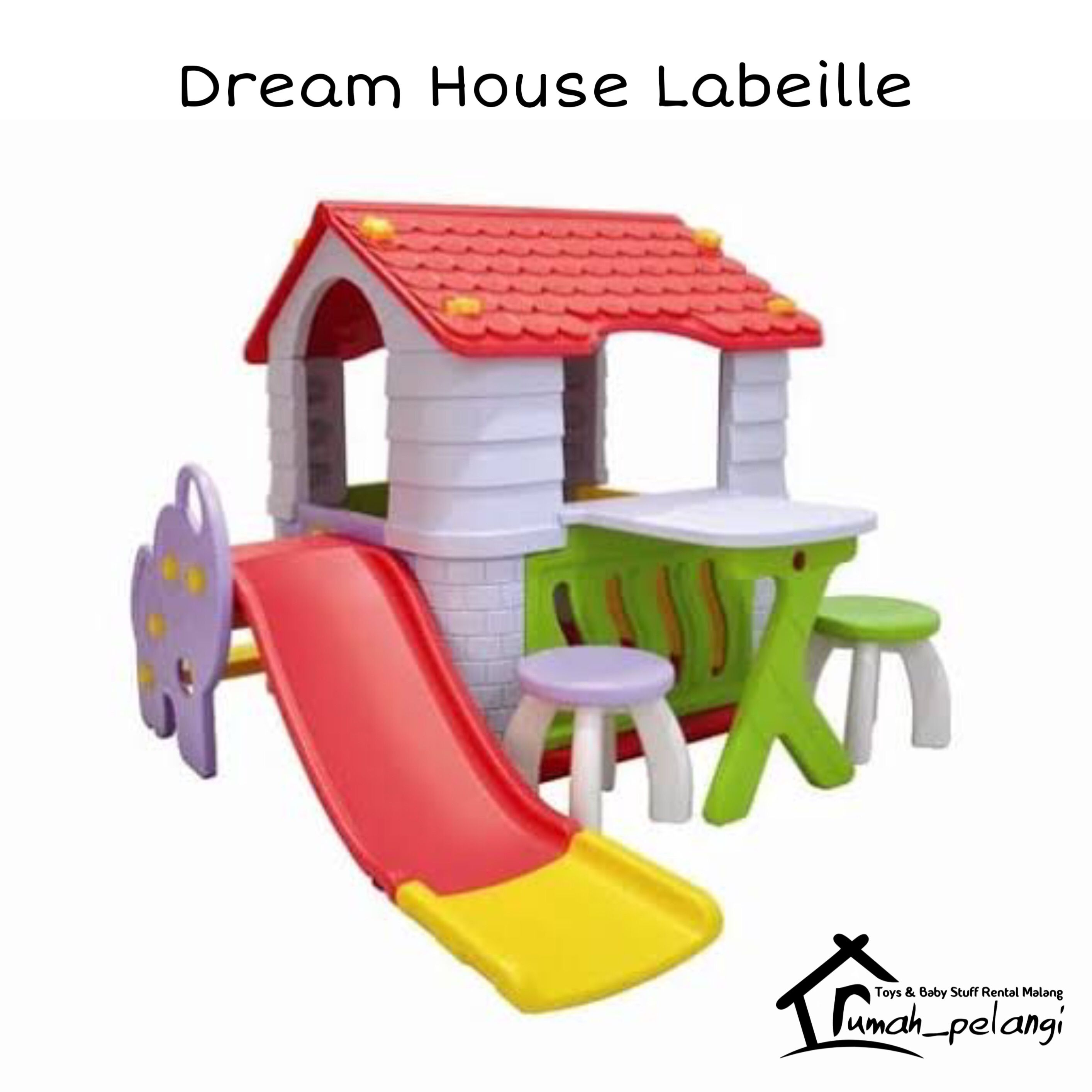 Miliki rumah-rumahan dari Labeille ini terbuat dari plastik yang aman BPA free dan mudah dirakit. Warna serta desain yang lucu dan menarik, interior atap berbentuk awan, bulan dan bintang bintang bernuansa ceria yang akan disukai anak-anak.