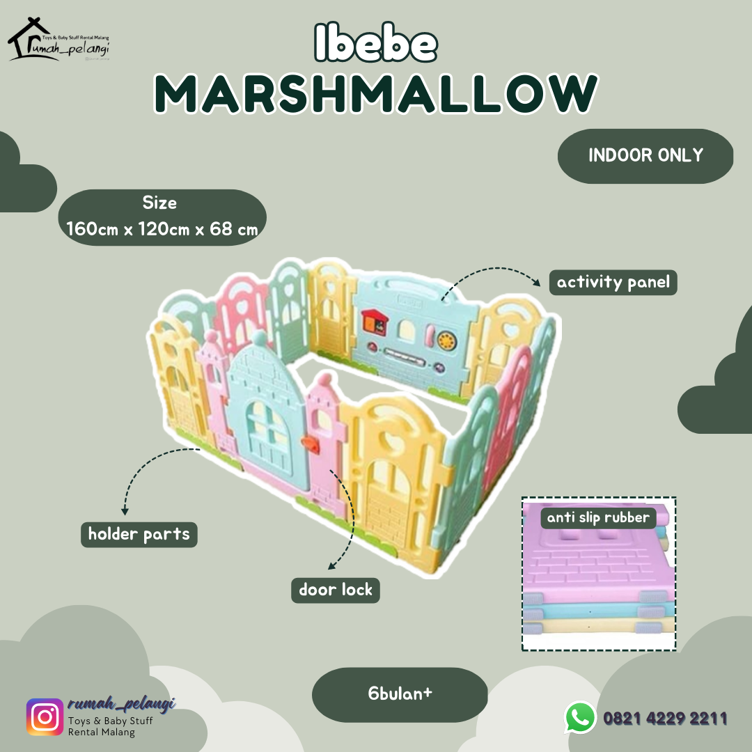 - 1 set ibebe tipe marshmallow terdapat 10 panel kecil, 1 activity panel, dan 1 pintu dengan kunci